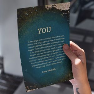 Reads: “Love Came First You don’t move on after loss, but you must move with. You must shake hands with grief, welcome her in, for she lives with you now. Pull her a chair at the table and offer her comfort. She is not the monster, you first thought her to be. She is love. And she will walk with you now, stay with you now, if you let her. And on the days when your anger is high, remember why she came, remember who she represents. Grief came to you my friend because love came first. Love came first.” Donna Ashworth